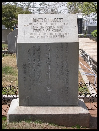 원래 헐버트 박사의 묘비를 이승만 박사가 써주기로 했는데 어찌된 연유인지 써주지 않아서 한동안 헐버트 박사의 묘비는 비어있는 상태로 방치되어 있었다. 그리고 김대중 대통령 때 헐버트 박사의 묘비에 이름을 새겨주었다. 그 비석에는 Friend of Korea라고 적혀 있다.