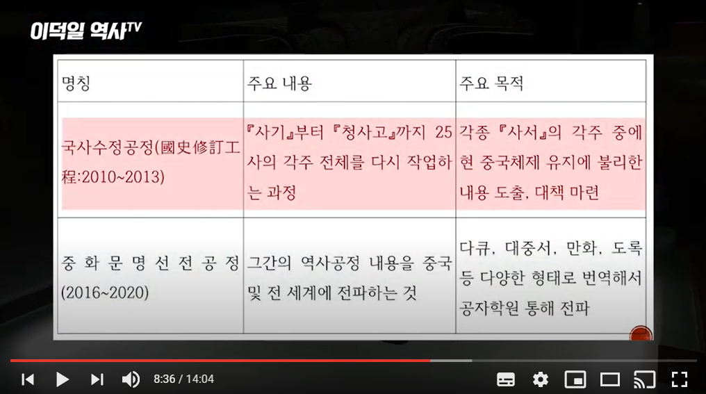 그런데 중국에서 국가 차원으로 역사공정을 하는 것보다 더 문제는 대한민국 정부에서 돈을 들여서 하는 것이다. 중국은 자기네 체계적인 목적을 가지고 역사를 만들어 가지만, 우리는 오히려 대한민국 국민들의 세금 가지고 중국의 동북공정을 옹호하고 일본 극우파의 식민사학을 옹호하는 그런 일들을 하고 있는 형편이다.