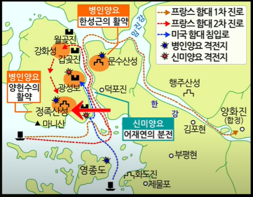 우선 프랑스 함대는 강화해협을 지나 양화진까지 들어왔다. 이때 병인박해로 죽은 조선인 신도의 가족들이 프랑스 함대의 길안내를 했다고 한다. (후에 김수환 추기경이 노무현 대통령에게 ‘종교 문제 때문에 국가와 민족에게 반하는 행위를 했음’을 천주교 수장으로 사과했다)