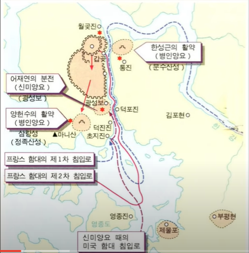 1866년 1월 우리 역사상 최대의 박해인 ‘병인박해’가 일어나서 조선인 신도 8천명이 죽고 프랑스 신부 12명 중에 9명이 죽게 된다. 이때 조선을 탈출한 리델 신부가 중국으로 건너가고, 청나라 텐진에 주둔하고 있던 프랑스 극동함대 사령관 로즈가 조선을 침략해 온다. 이것이 병인양요(1866.9~10)이다. (병인양요가 있기 두 달전인 1866년 7월에는 제너럴셔면호 사건이 일어났다)