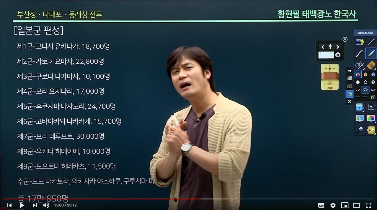 당시 일본군은 18만의 대군이 조선으로 건너왔다. 제1선발인 고니시 유키나가의 사위가 쓰시마섬 도주인 소 요시토시(1568~1615)였으며, 그도 전쟁 반대의 입장이었다. 3선발인 구로다 나가마사의 아버지는 토요토미 히데요시의 책사였다. 제8군의 우키타 히데이에는 당시 20세의 나이로 총 사령관이 되었는데, 토요토미 히데요시의 양자였다. 토요토미가 조선을 정벌한 이후에 우키타에게 조선의 왕으로 삼겠다는 말을 들어서 그랬는지 모르지만 조선 백성을 학살하는 것에 반대한다. (이들은 내 백성이 될 것이다!) 제9군의 토요토미 히데카츠는 토요토미 히데요시의 조카였다. 수군의 와키자카 야스하루는 용인전투에서 활약하였는데, 이후 한산도에서 이순신에게 털리고 근처 섬으로 들어가서 미역만 먹고 견디다가 간신히 살아남은 사람이다. (와키자카 후손들은 와키자카 제삿날에 미역만 먹는 풍습이 있다)