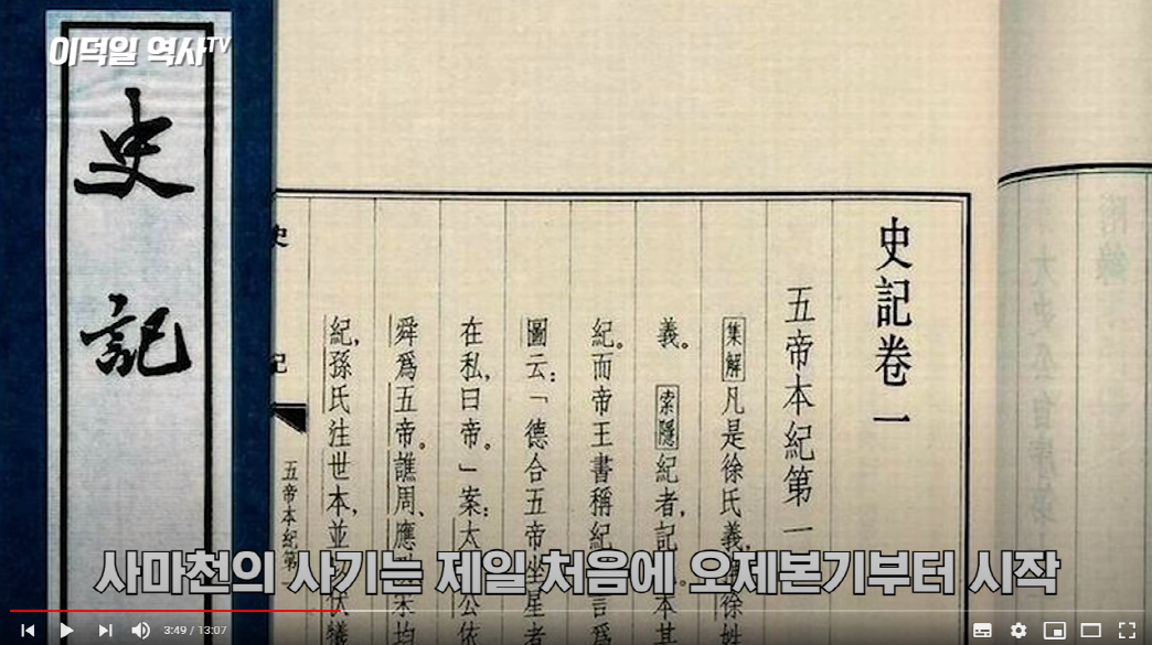 사마천은 중국사의 시작을 동이족 집단인 치우와 하화족 영수인 황제와 싸움으로 시작한다. 중국인들은 사마천이 사기에서 말한 황제를 현재 중국인들의 공통의 조상으로 여기고 있다. 이것은 사마천이 사기를 편찬할 때 고민을 많이 한 것이다. 사마천의 사기는 제일 처음에 ‘오제본기’부터 시작한다. 오제본기는 고대의 다섯 개 왕(황제, 전국, 제곡, 요, 순)이 있었고, 다섯 명의 제왕 다음에 하나라가 시작하고, 이것이 은나라, 주나라로 이어져서 춘추전국시대가 돼서 진니라의 통일 시기를 거쳐서 한나라(사마천이 살고 있던)로 이어졌다. 이것이 사마천의 역사인식이다. 문제는 사마천이 사기를 편찬하기 위해서 몇 가지 계보를 조정하였다. 정확하게는 왜곡한 것이다. (한가람 역사연구소에서 사기를 간행하기 위해 준비하고 있다)