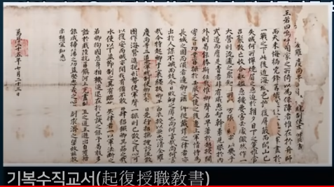 기복수직교서(起復授職敎書) - 선조가 임진왜란 중 이순신을 내친 것을 후회하며 어머님 상중인 그를 다시 통제사에 임명하는 내용.