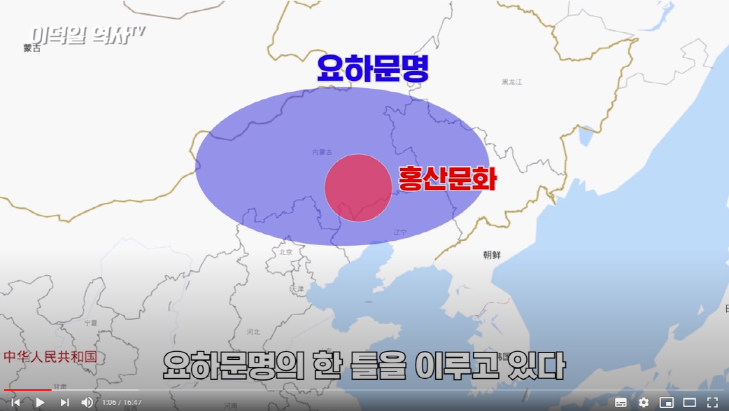 (문명은 문화보다 조금 큰 개념으로) 요하문명은 지금의 하북성, 내몽골, 요녕성, 그것보다는 조금 더 크다고 볼 수 있는데... 이쪽 지역에 광범위하게 퍼져있는 신석기 문화부터 청동기 문화로 이어지는 고대 문명이다. 그리고 이 요하문명의 속에 홍산문화라는 작은 우리가 많이 들어본 홍산문화는 그 중의 한 문명으로 요하문명 속에 홍산문화라는 하나의 작은 문화가 요하문명의 한 틀을 이루고 있다.